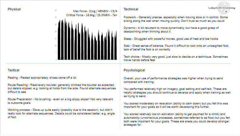 We will assess how you climb, your physical ability, tactics and psychological skills. This includes in-person observation by a technique coach; a set of physical tests supported by the latest in sport science research; and, psychometric tests of psychological skills and strategies.